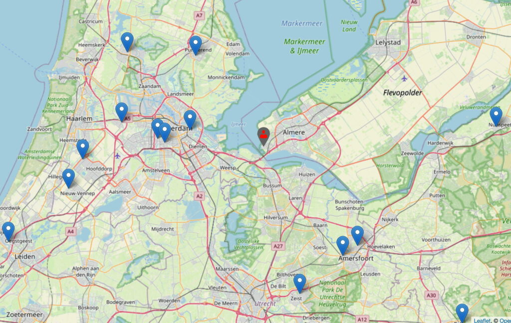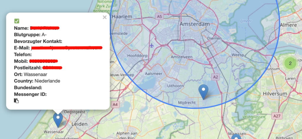 As mentioned above, only you as a logged in member will see this data. In the case of a blood donation referral, the person in need of a transfusion or the hospital where they are staying can receive the contact details of the geographically closest matches for the potential transfusion. In this anonymized example, where a fictitious member in Amsterdam needs a transfusion, you will see a green โ at the top, which means that the identity of this member is verified, but he has not performed the analysis.