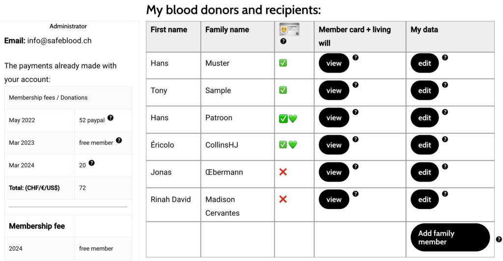 You can. Basically, every member – including children – is a full individual member with us, since we draw blood as individuals when needed. However, as the head of the family or family representative, you can first register yourself and then add other family members. The majority of our members register as a family – this probably has to do with the fact that people are more concerned about the quality of their blood when they have children. The cost is 50 CHF/EUR/USD per adult per year, children and teenagers up to 18 years (or as long as they are in education) are free. However, the same applies here: These are only guidelines. If you can, pay these amounts (or more if you want), but if that puts too much strain on your budget, pay whatever you can – there is no lower limit: the free choice of blood and thus your membership with us should not and must not depend on your financial possibilities, but must be a human right.