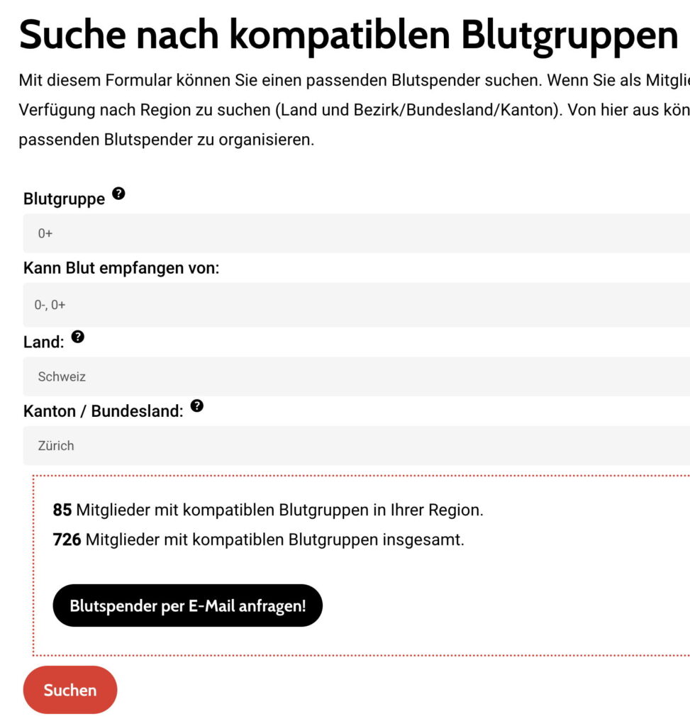 Facciamo l’ipotesi che stiate cercando un donatore di sangue, diciamo per un intervento chirurgico programmato tra 4 settimane. Se siete un membro della nostra organizzazione e andate alla pagina “Cerca donatori di sangue”, lì inserite il vostro gruppo sanguigno, il paese e la regione in cui avrete bisogno di un donatore e, ad esempio, otterrete il seguente risultato: