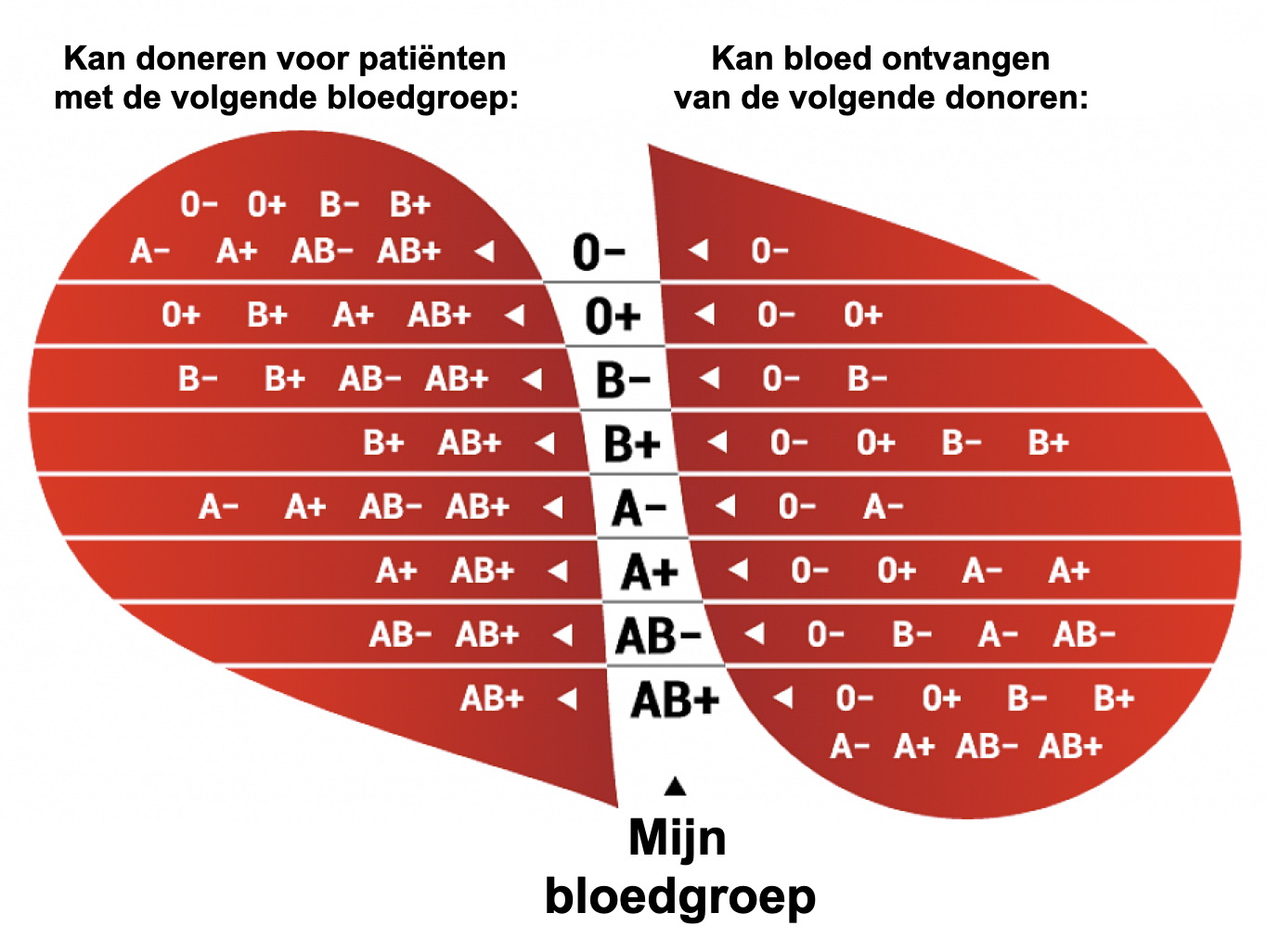 Meer informatie over de bloedgroepen van onze leden en over bloedgroepcompatibiliteit in het algemeen vindt u hier: https://safeblood.nl/nl/bloedgroep-diagrammens/